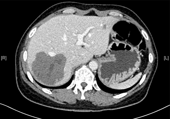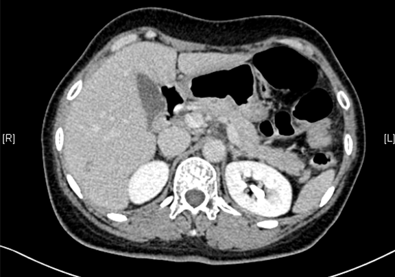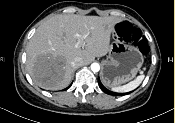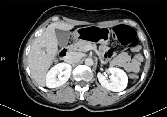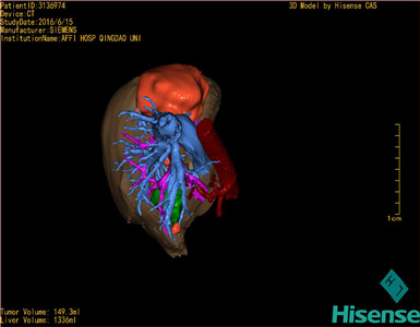 现病史:患者于10天前因右上腹外伤于当地医院查体发现肝占位,右上腹隐痛,无腰背部放射痛、皮肤巩膜黄染、恶心、呕吐、寒战、高热、腹泻、血便、咳嗽、咳痰、胸闷、气短、尿频、尿急、尿痛、血尿。行上腹部增强CT示:肝脏多发血管瘤可能性大,胰尾部小囊肿可能性大,左侧输尿管扩张积水,建议手术治疗。