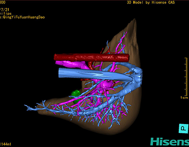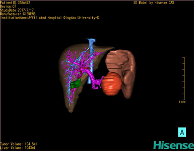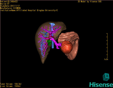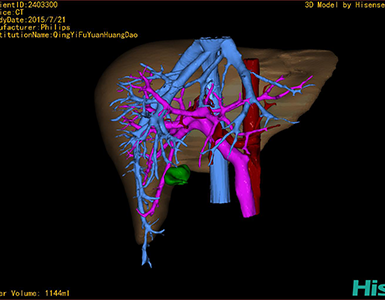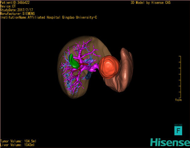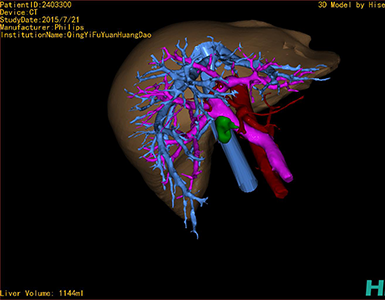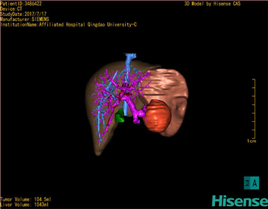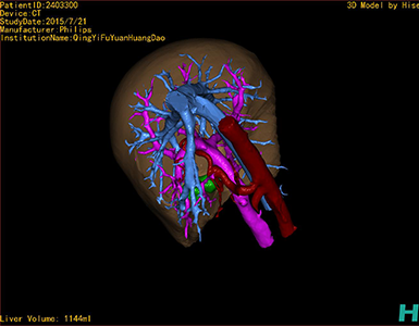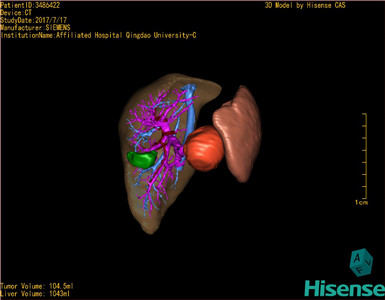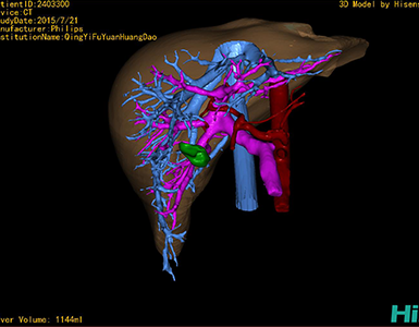 通过调节窗宽窗位调整CT序号,对肿瘤,肝实质,胆囊,下腔静脉,肿瘤,肝动脉、门静脉及肝静脉等进行三维重建;系统自动计算肿瘤体积和肝脏体积。