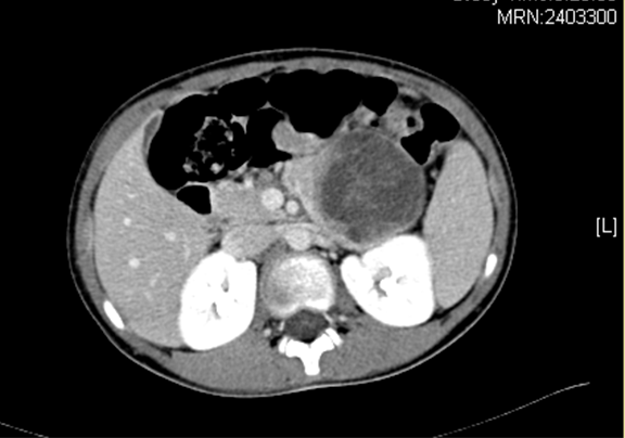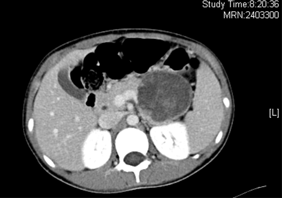 现病史:半天前患儿无明显诱因出现腹痛,以左上腹为著,呈持续性,阵发性加重,伴有呕吐,为胃内容物,于当地医院就诊,行B超检查示:胰尾部占位,于我院黄岛分院就诊,行CT检查,示:腹腔内占位,现为进一步治疗收入我科。患儿自发病来,精神、饮食差,睡眠可,大小便无异常。