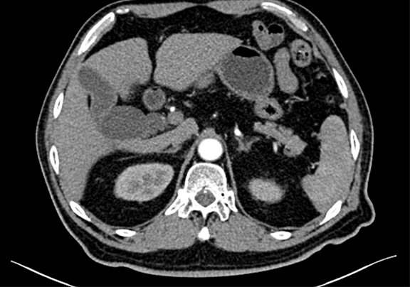 查体:腹部平坦,对称,无腹壁静脉曲张,无胃肠型和蠕动波,腹部柔软,右侧肋缘下轻度压痛,无反跳痛,未触及异常包块。肝、脾肋下未触及、质软、无压痛,Murphy氏征阴性。腹部叩诊:肝上界在右锁骨中线第五肋间,肝、肾区无叩击痛,无移动性浊音。肠鸣音正常,4次/分。未听到血管杂音。