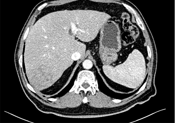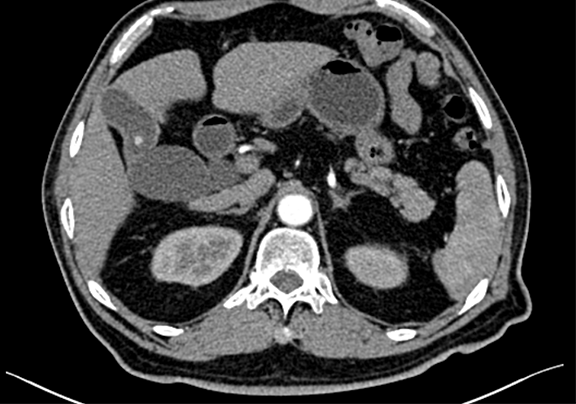现病史:患者9天前无明显诱因查体发现肝内占位性病变,右侧肋缘下轻度触痛,无区域放射,尚可耐受,与体位、活动无关,偶发间断性头晕、头痛,自诉50余年胆囊结石病史,无予以特殊治疗及药物服用,无恶心、呕吐,无腹痛、腹胀,无右侧肩部放射痛,无胸闷、胸痛,无咳嗽、咳痰,无睡眠障碍,小便轻度尿刺痛感,饮食正常,2016-05-23于我院行健康查体显示:肝脏体积正常,肝内呈细密点状回声,欠均匀,探及一枚等低回声结节,大小约6.0cm ×5.0cm 呈椭圆形,内部回声较均匀,胆囊大小形态正常,毛糙,内见一乳头样高回声,大小约0.7cm ×0.6cm 不随体位移动,后方无声影,囊腔内可见强回声,呈泥沙样及胆泥样,范围约4.2cm× 1.9cm 后伴声影,随体位改变移动。脂肪肝(轻度)肝内结节 考虑血管瘤,建议CT随访,胆囊息肉,胆囊炎并胆囊结石,患者自发病以来未予以特殊治疗及用药。