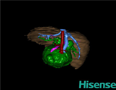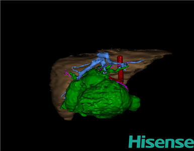 通过调节窗宽窗位调整CT序号,对肝实质,胆囊,下腔静脉,肿瘤,肝动脉、门静脉及肝静脉等进行三维重建;系统自动计算肝脏体积。