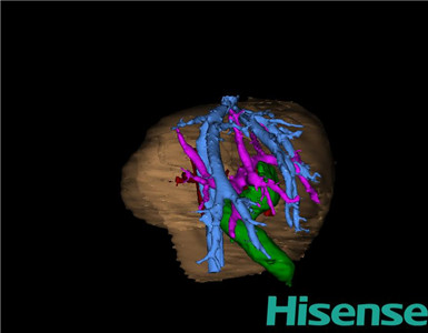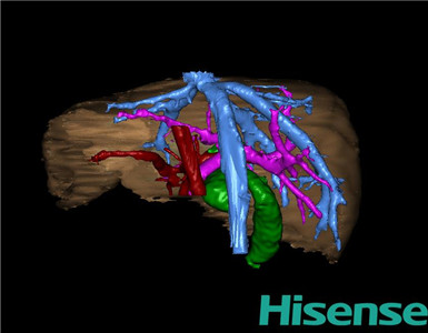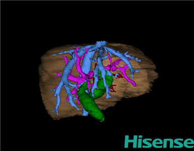 通过调节窗宽窗位调整CT序号,对肝实质,胆囊,下腔静脉,肿瘤,肝动脉、门静脉及肝静脉等进行三维重建;系统自动计算肝脏体积。