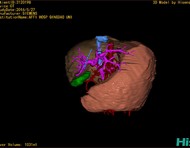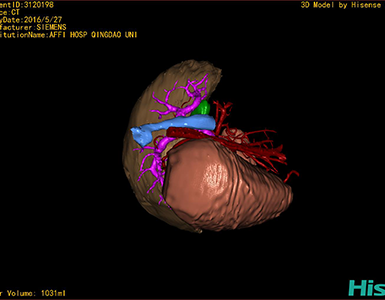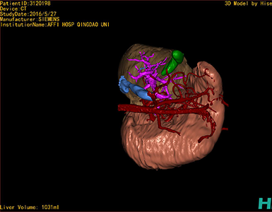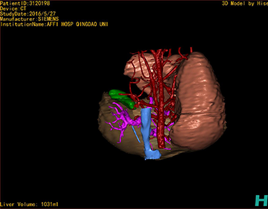 通过调节窗宽窗位调整CT序号,对肝实质,胆囊,下腔静脉,肝动脉、门静脉及肝静脉等进行三维重建,明确血管走行;系统自动计算肝脏体积。