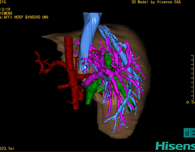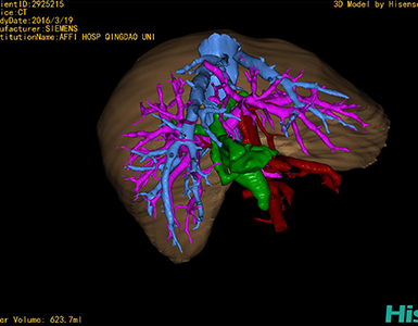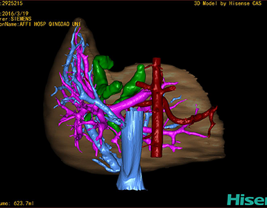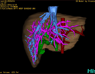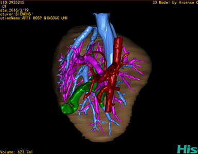 通过调节窗宽窗位调整CT序号,对肝实质,胆囊,下腔静脉,肿瘤,肝动脉、门静脉及肝静脉等进行三维重建;系统自动计算肝脏体积。