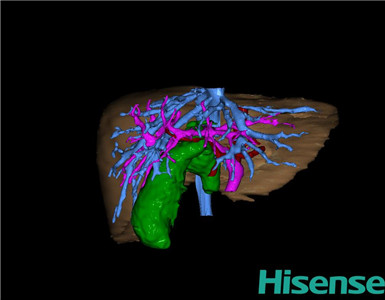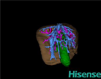 通过调节窗宽窗位调整CT序号,对肝实质,胆囊,胆总管,下腔静脉,肝动脉、门静脉及肝静脉等进行三维重建;系统自动计算肝脏体积。