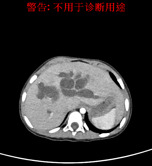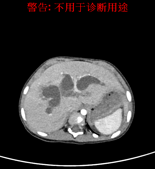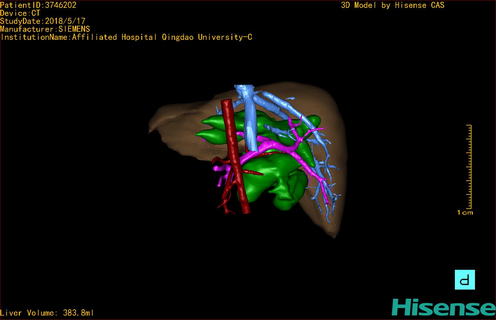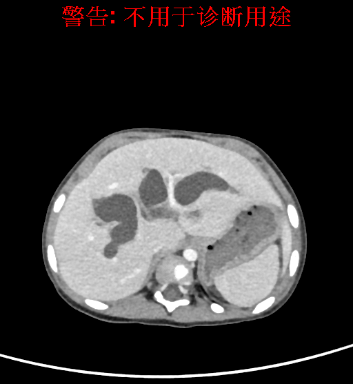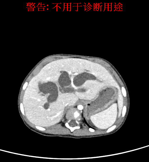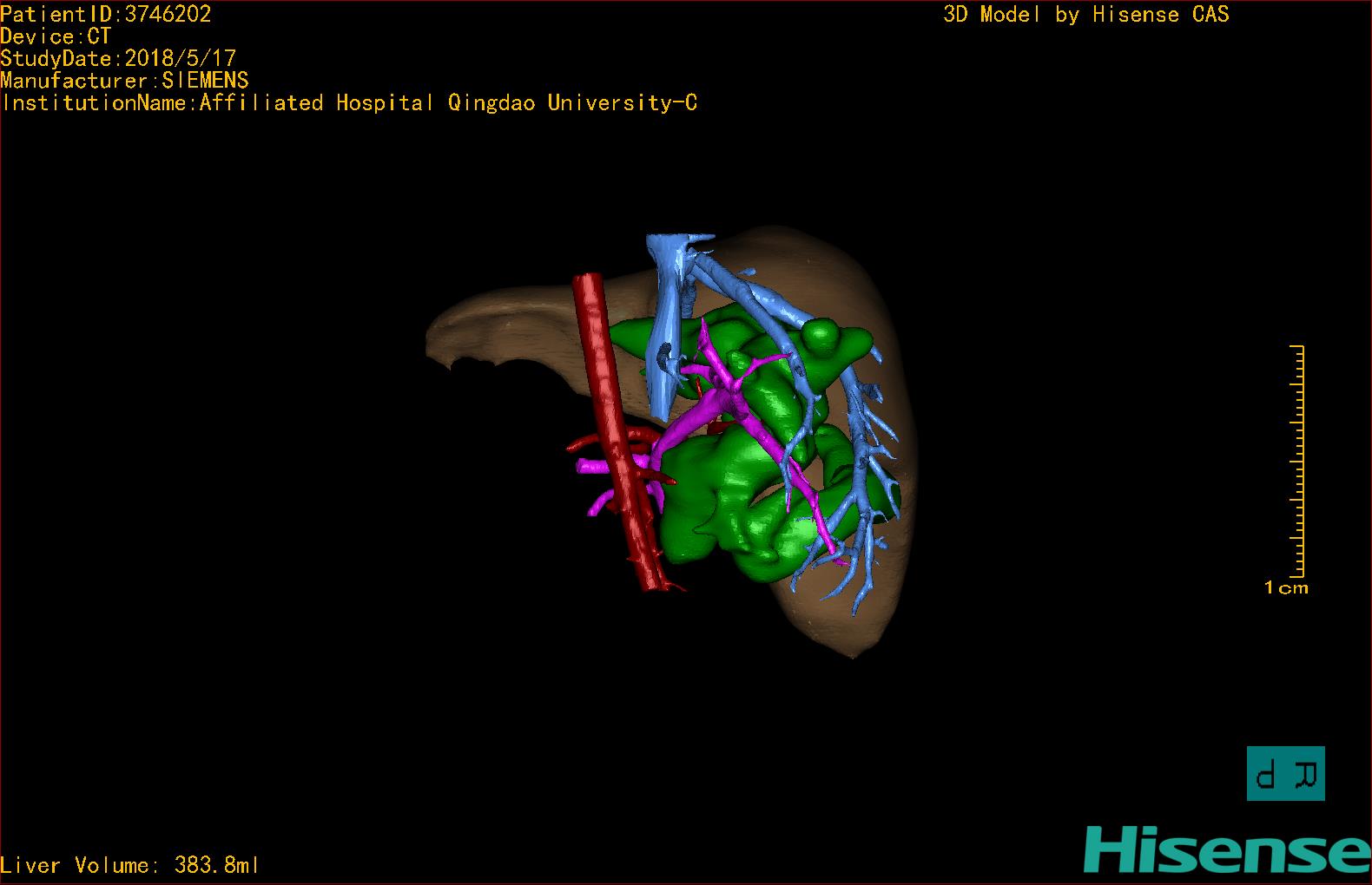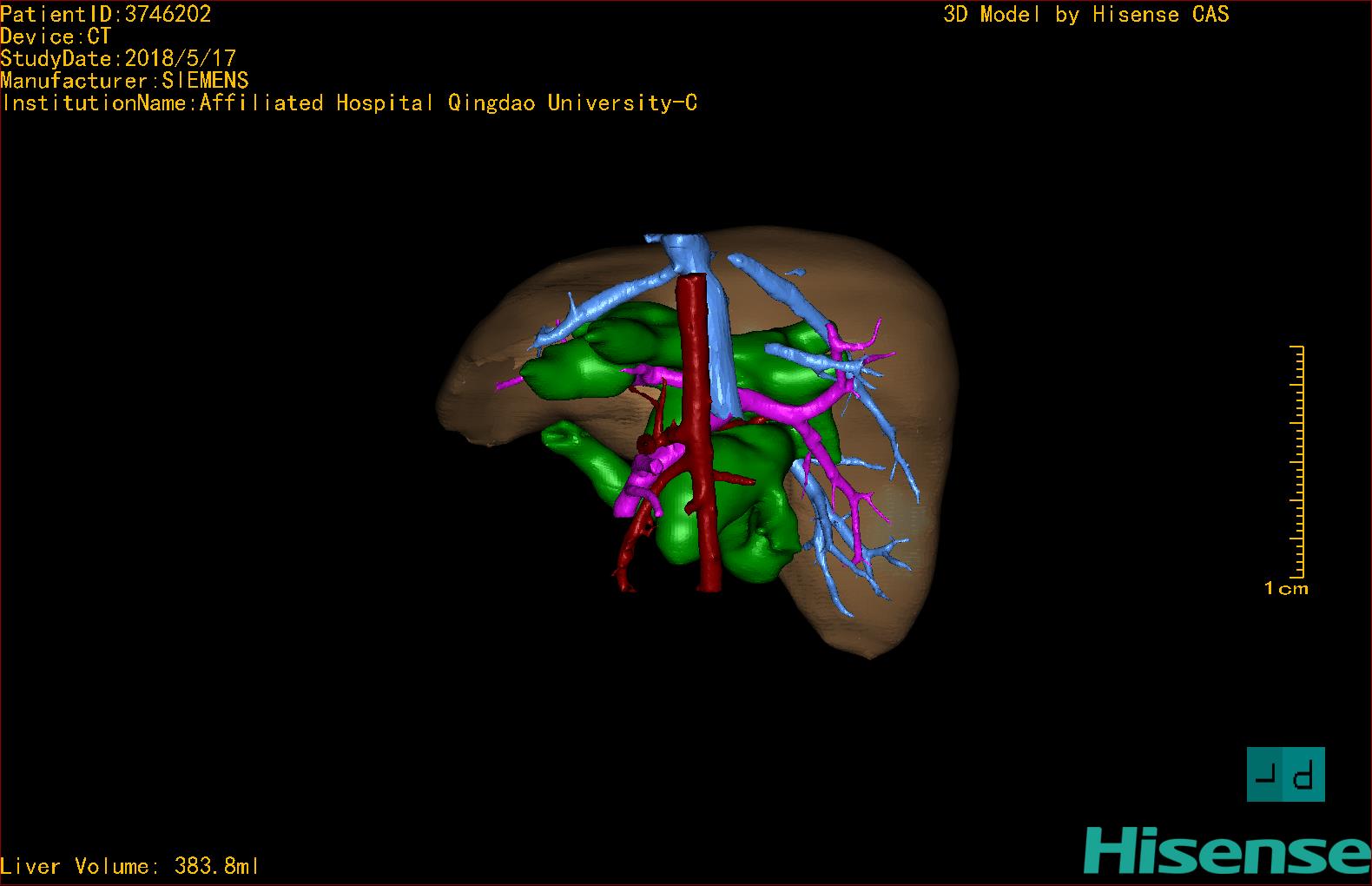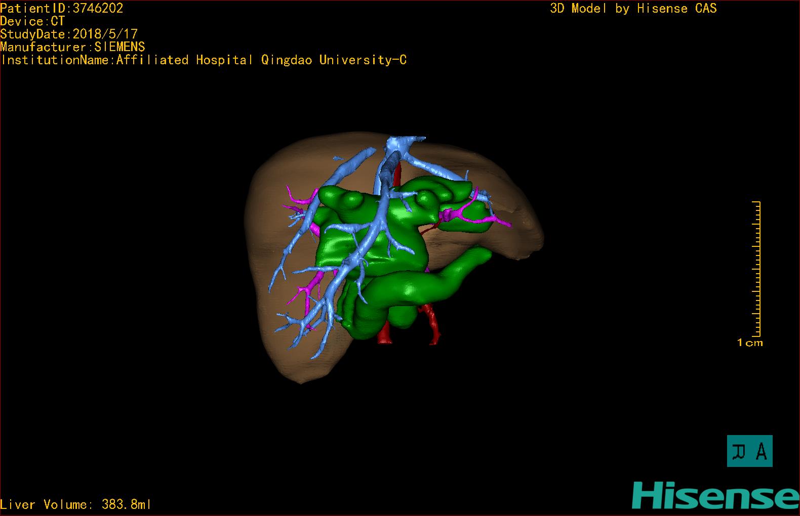 实验室检查: 血常规:血常规:WBC 11.49*109/L,NEU3.60*109/L,RBC4.36*1012/L,HB 119g/L, PLT 411*109/L,MCHC 318.0g/L, PCT 0.45%, RET% 1.64% 生化全套:ALT 18.00 U/L, AST 44.00 U/L, ALT/AST 0.41, ALB 47.35g/L,BIL-T 6.60 umol/L, BIT-D 2.68 umol/L, BUN 4.80 mmol/L, CREA 18.00 umol/L 肝炎全套: 炎症反应标志物: 诊疗过程: CT结果输入海信CAS系统后行3D重建及手术规划后,于2018-6-7全麻下行“胆囊切除+胆总管囊肿切除+肝总管空肠吻合术”手术治疗: 术前三维重建及手术方案设计: 将0.625mm双源薄层CT资料的静脉期和动脉期Dicom格式文件导入海信CAS系统。 通过调节窗宽窗位调整CT序号,对肝实质,胆囊,下腔静脉,肿瘤,肝动脉、门静脉及肝静脉等进行三维重建;系统自动计算肝脏体积,肝脏体积为383.8ml,通过术前模拟手术,精准判断手术切除范围,进行精密术前规划及讨论后实施手术。 手术步骤: 麻醉成功后,患儿取平卧位,2.5%碘伏消毒手术区皮肤,铺无菌巾单。取右上腹纵口长约5m,切开皮肤、皮下织组,腹直肌前鞘、腹直肌,后鞘和腹膜。探查见:胆总管3×2cm大小,胆囊管迂曲,长约10cm。剥离、切除胆囊,游离胆总管,将之横断:①近端即肝总管,剪裁后被吻合用;②远端游离切除囊肿内壁,直至胆总管开口于十二指肠处,冲洗后予以结扎缝扎。距treits韧带20cm处横断空肠:①近端与其远端25cm处的空肠侧壁行端侧双层吻合,吻合口通畅;②远端断端封闭,其侧壁剪开,并经横结肠后提至肝门处,与剪裁的肝总管行端侧双层吻合。缝合修补胆囊床及系膜裂孔,肝门部放置橡胶引流管一根。温盐水冲洗腹腔。检查无活动性出血,清点纱布器械无误,依次缝合腹壁各层。手术顺利,麻醉满意,出血不多,未输血,术后病人先进入麻醉恢复室,苏醒后回病房。手术时术者可开启Hisense CAS系统手势控制功能,对肝脏及胆囊解剖结构进行实时、全方观察、评估,起到术中导航作用。 术后病理: 1. (囊肿壁)囊肿性病变,囊壁构成于增生的纤维组织呈慢性炎,内衬假复层柱状上皮,囊壁内见较多增生的腺体。请结合临床。 2. 慢性胆囊炎。 随访情况: 患儿术后2周恢复良好 术前CT检查:动脉期