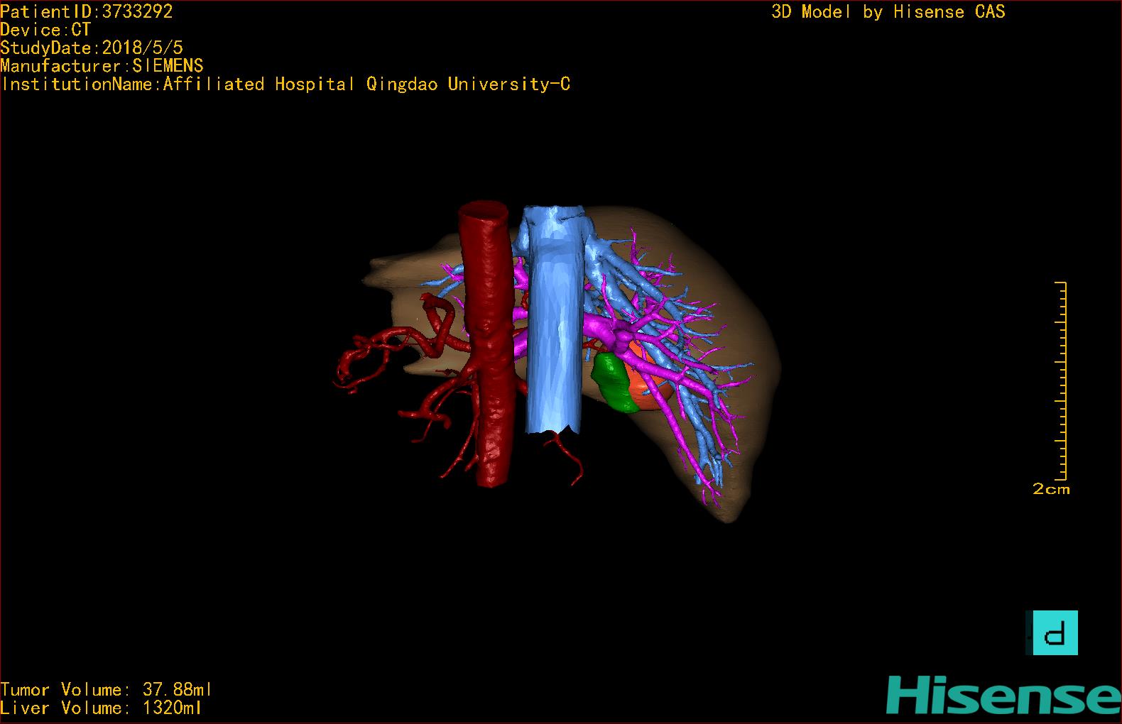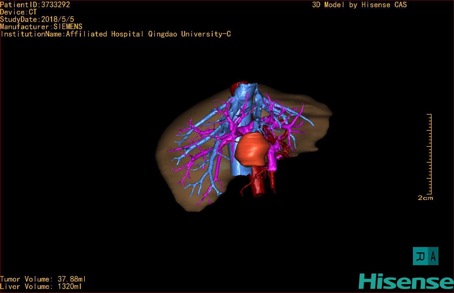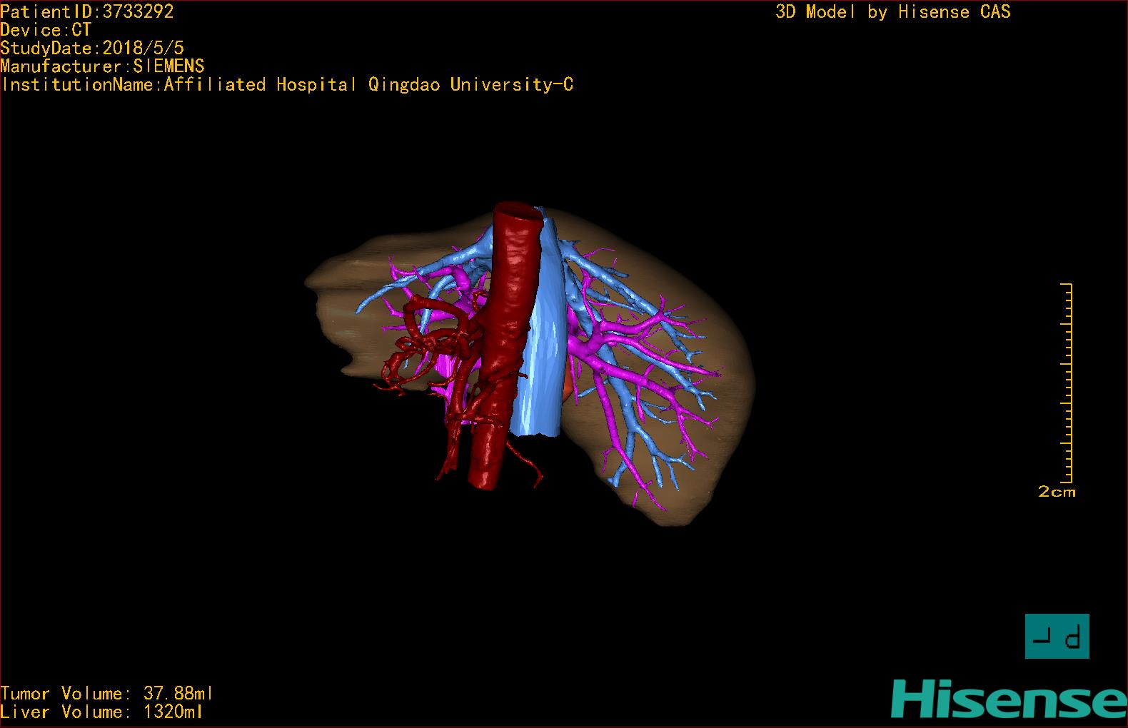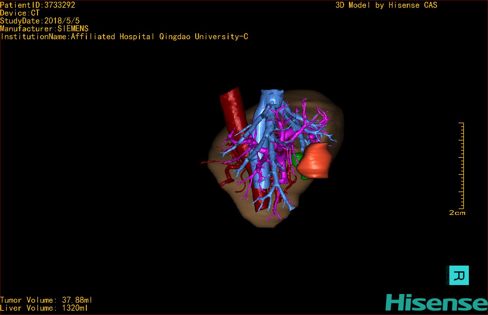 CT结果输入海信CAS系统后行3D重建及手术规划后,于2018-5-8全麻下行“肝IV、V段部分切除术+胆囊切除术”手术治疗
