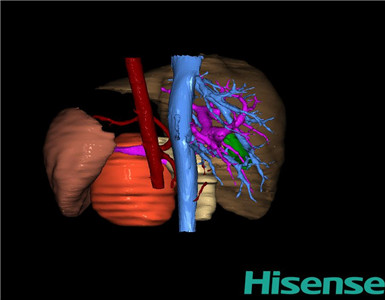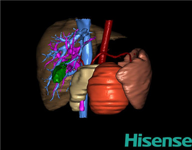 通过调节窗宽窗位调整CT序号,对肝实质,胆囊,下腔静脉,肿瘤,肝动脉、门静脉及肝静脉等进行三维重建;系统自动计算肝脏体积。