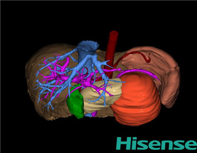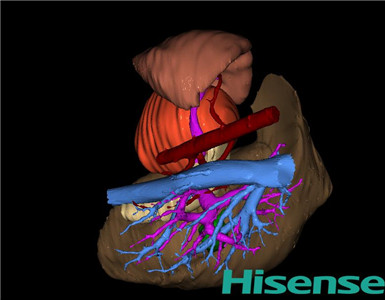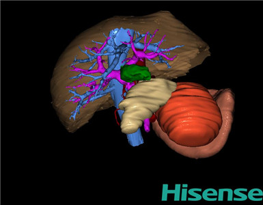 根据手术规划系统提供最优虚拟手术步骤,麻醉成功后,患儿取平卧位,2.5%碘伏消毒手术区皮肤,铺无菌巾单。取左上腹腹横纹切口长约10cm,切开皮肤、皮下、肌层,剪开腹膜。探查见:胰腺体尾部约15*10*10cm质韧肿物,包膜完整,与周围组织无粘连,决定行脾脏切除+胰腺肿物切除术。先离断并结扎脾胃韧带、脾结肠韧带及脾肾韧带,游离并缝扎脾动静脉后切除脾脏。取5块脾片再植于大网膜内。于胰腺肿物与正常胰腺交界处切除肿物,间断缝合胰体断端及脾床创面,脾窝置引流管1条,自左侧腹引出、固定。清点器械、纱布无误后,逐层关腹。检查无活动性出血,清点纱布器械无误,依次缝合腹壁各层。手术顺利,麻醉满意,出血不多,未输血,术后病人送回病房。术后标本家属过目,送检病理。手术时手术者可开启Hisense CAS系统手势控制功能,对肝脏的解剖结构进行实时、全方观察、评估,起到术中导航作用。