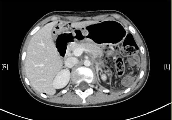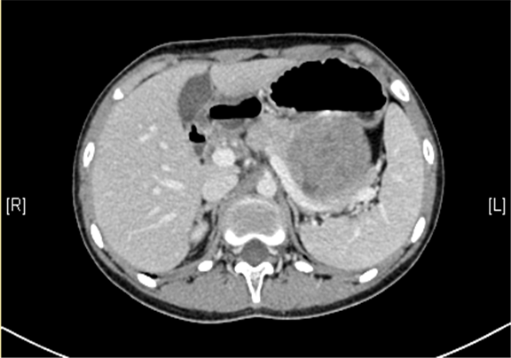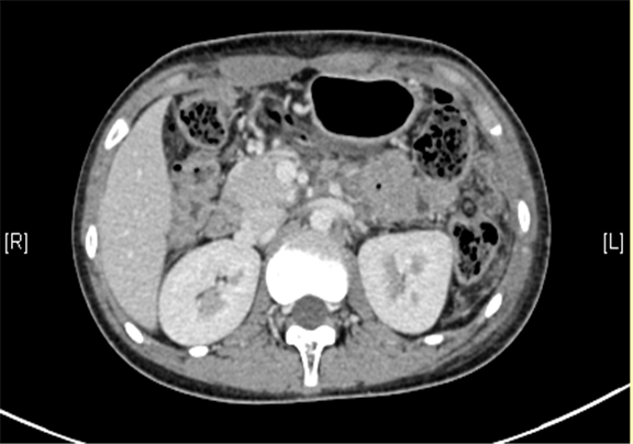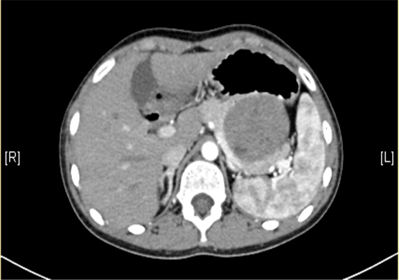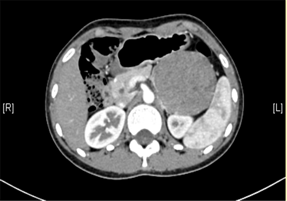 上腹部三维CT动态增强扫描: 胰腺体尾部类圆形软组织肿块,考虑实性假乳头状瘤可能性大。