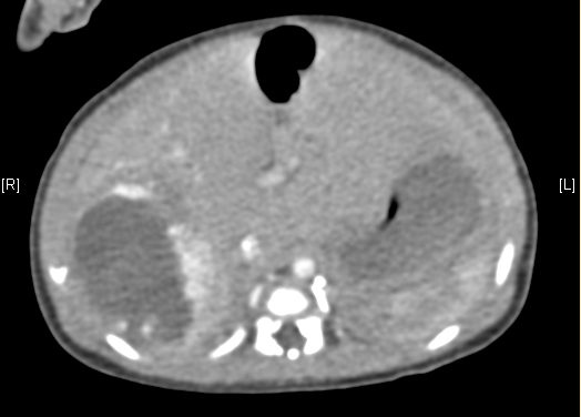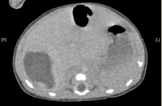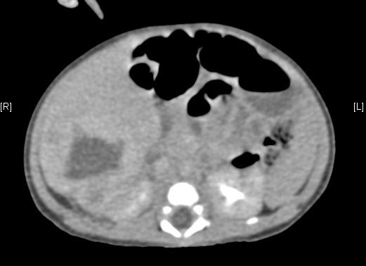 现病史:25天时无明显诱因反复发热,以“1.感染性休克,2.败血症”收入我院新生儿科,予以抗生素等对症治疗,B超示:右肝内肿块,考虑肝肿瘤可能大;上腹部增强CT示:肝脏右后叶血管源性肿瘤可能性大。甲胎蛋白 AFP >1210.00 ng/mL,为求进一步诊治于我科门诊就诊,门诊以"肝脏肿瘤"收入院。自发病来,患儿精神好,饮食睡眠可,大便无异常,体重无明显减轻。