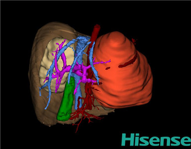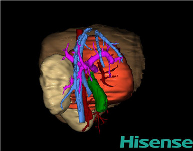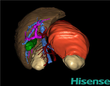 通过调节窗宽窗位调整CT序号,对肿瘤,肝实质,胆囊,下腔静脉,肿瘤,肝动脉、门静脉及肝静脉等进行三维重建;系统自动计算肿瘤体积和肝脏体积。