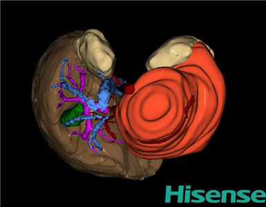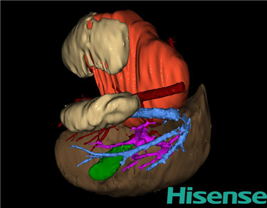 根据手术规划系统提供最优虚拟肝切除步骤解剖沿降结肠外侧切开侧腹膜,切开肾周脂肪囊,显露整个肾脏,见肿瘤位于整个肾脏,约20×15×10cm大小,质地硬,肿物下极包膜破裂并血肿形成。与胰腺、脾脏及降结肠粘连紧密,下极包绕肠系膜上动脉,无法分离并切除,遂决定仅行活检术。在肿物外侧电刀切取约1*1cm大小肿物,防止凝胶海绵1块1-0丝线缝合肿物。检查无活动性出血,清点纱布器械无误,依次缝合腹壁各层。手术顺利,麻醉满意,出血不多,未输血,术后病人先进入麻醉恢复室,苏醒后回病房。术后标本送术中冰冻病理检查,结果回示:小圆细胞恶性肿瘤。手术时手术者可开启Hisense CAS系统手势控制功能,对肿瘤的解剖结构进行实时、全方观察、评估,起到术中导航作用。