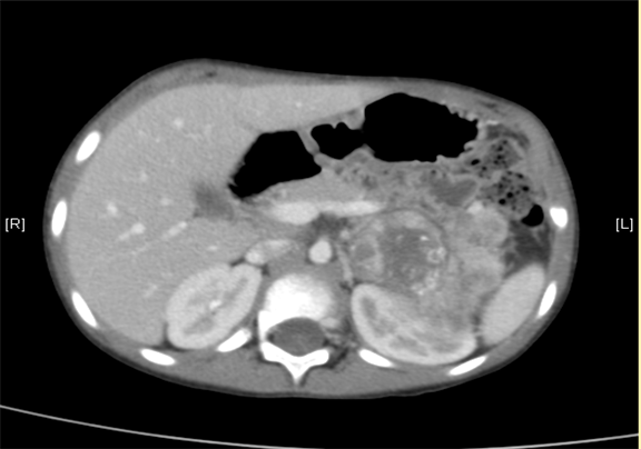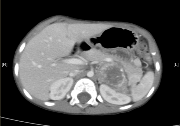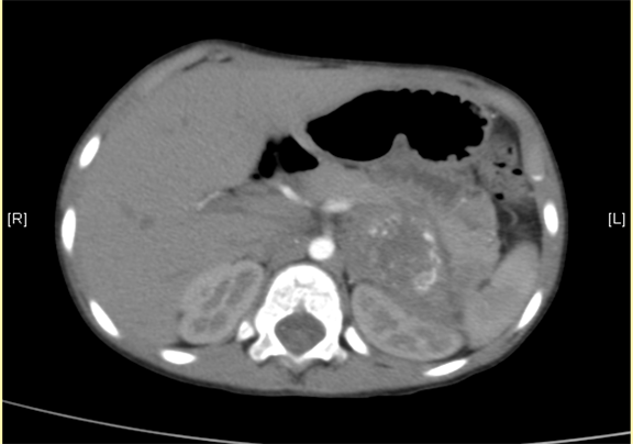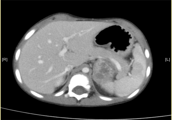 下腹部增强CT示:神经母细胞瘤。