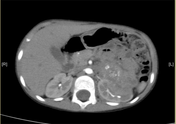 现病史:查体发现左侧腹部肿物,无疼痛,无发热、寒战,无尿频尿急、无尿失禁,无恶心呕吐,体重增加缓慢,大小便正常。